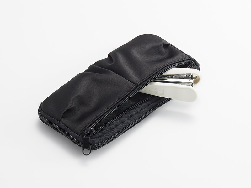 ペンケース本体だけでなく、フロント面のドレープポケットを広げて、ホチキスやテープのり、小型の充電器などを収納できます。​